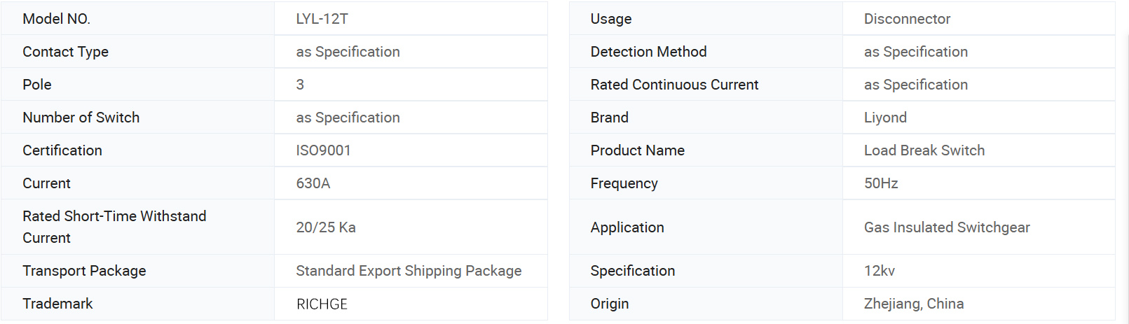 LYL-12T belastningsbryter samsvarer med de relevante kravene til GB3804-2004 "3,6kV~40,5kV høyspenningsvekselstrømbryter" og GB16926-1997 "AC-høyspentbelastningsbryter-sikringskombinasjonsapparat". Hovedkrets: 630A-20kA (4s), 25kA (3s); Mekanisk levetid: 5000 ganger; Jordingskrets: 20kA (2s); Mekanisk levetid: 2000 ganger.