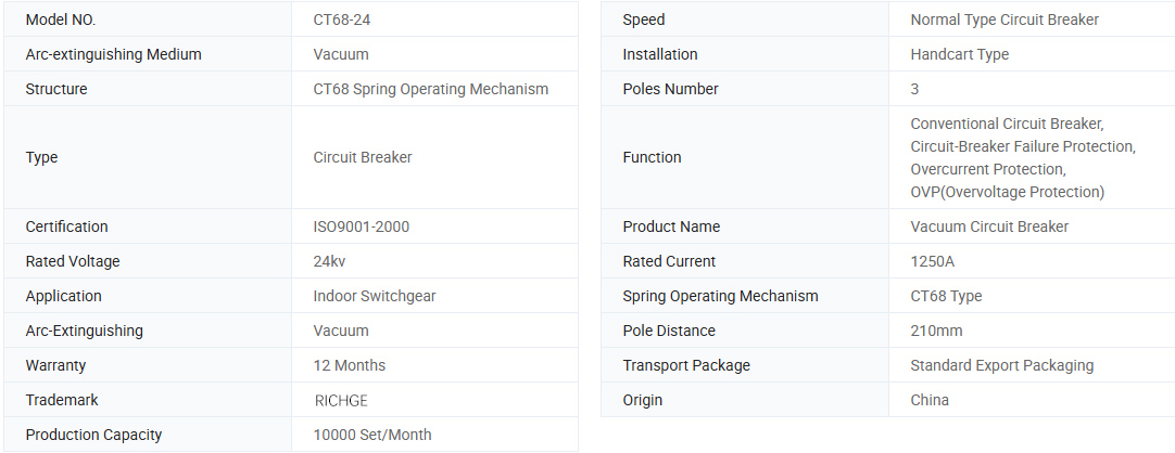 Modell CT68 -24 innendørs vakuumskretsbryterbruk med CT68 fjærdriftsmekanisme. Det er trefaset AC, 50 Hz innendørs strømditribusjonsutstyr med spenningen på 24 kV.
