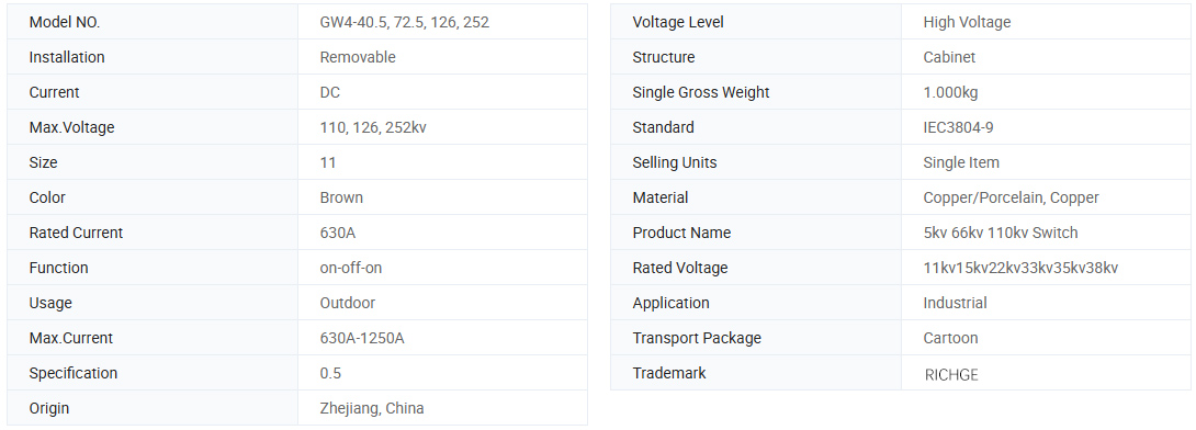 GW4-12(40.5) utendørs AC høyspenningsbryter brukes til å åpne og lukke krets med spenning men ubelastet 50/60Hz, 12(40.5)kV strømsystem. Den samsvarer med standarder for IEC129-1984 AC-frakoblingsbryter og jordingsbryter og GB1985 og andre relative standarder.