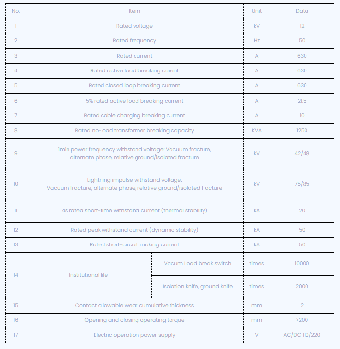 Dette produktet har kompakt struktur, lite volum, lang levetid, sterk lukking og bruddkapasitet og enkel drift og vedlikehold. Vakuumbryteren er utstyrt med en fjærdrevet mekanisme, som vedtar en elektrisk motor (en annen manuell) fjærenergilagring, og det er to typer lukkemetoder: Elektromagnetlukking og manuell splitting og lukking. Frakoblingsbryteren, vakuumbryteren og jordingbryteren er sammenlåst med hverandre (mekanisk sammenkobling) for å forhindre feiloperasjon.