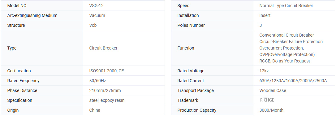 VSG-12 Type innendørs høyspenningsvakuumskretsbryter Brukt fjær til lagringsenergi. Driftsmekanismen kan betjenes på to måter, ved manuell og elektromotiv drift, er egenskapene i henhold til GB1984-2003 høyspenning AC-effektbryter, JB3855-1996 3.6-4.5KV innendørs AC High Voltage AC Circuit Breaker and I IEC Standard 62111-1-100: