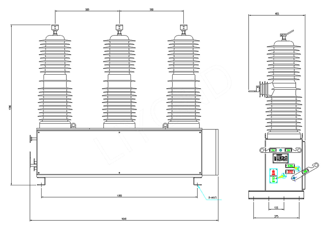 (1) ZW32-40.5-serie produkter totalt sett for søyletypen, trefaset vanlig montert på en mekanismeboks, den dynamiske enden av intersrupter-rommet gjennom bøyningsarmen, isolerte bindestenger for utgangsakselen til mekanismen tilkoblet. Mekanismen og tilkoblingsstangen som er koblet til effektbryteren er i en vanntett boks. Overføringsmekanismen til effektbryteren er sammensatt av en tilkoblingsstang og en krykkearm, og den dynamiske enden av sammenbruddskammeret er koblet til utgangsakselen til driftsmekanismen gjennom en krykkearm, en isolert bindestang, en forbindelsesstang og en driftsmekanisme. Rotasjonen av utgangsakselen drives for å realisere den dynamiske kontakten til buelikringskammeret for å utføre splitting og lukkende handling.